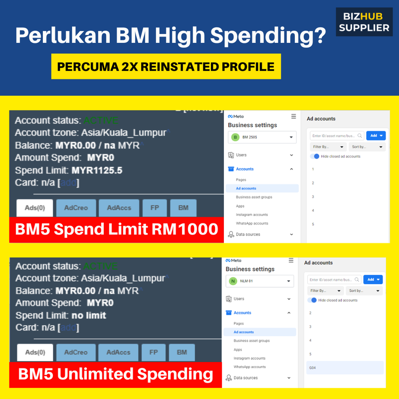 Old Reinstated BM + 5 Ad Account (Spend Limit RM1000+/Ad Account)